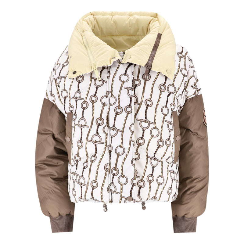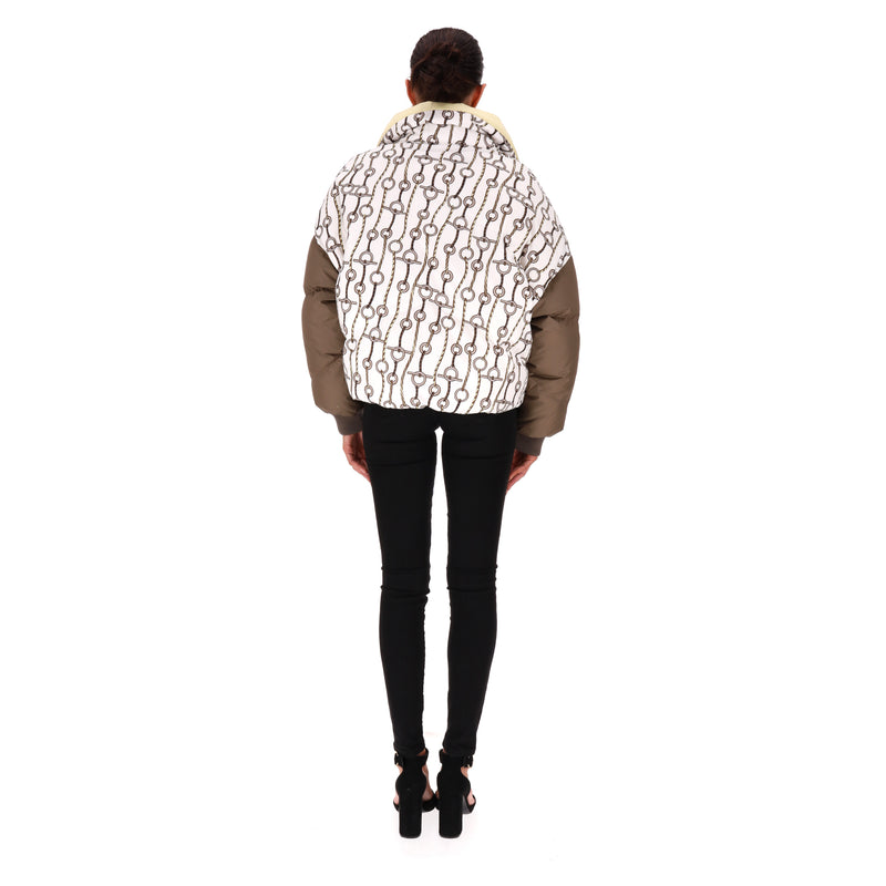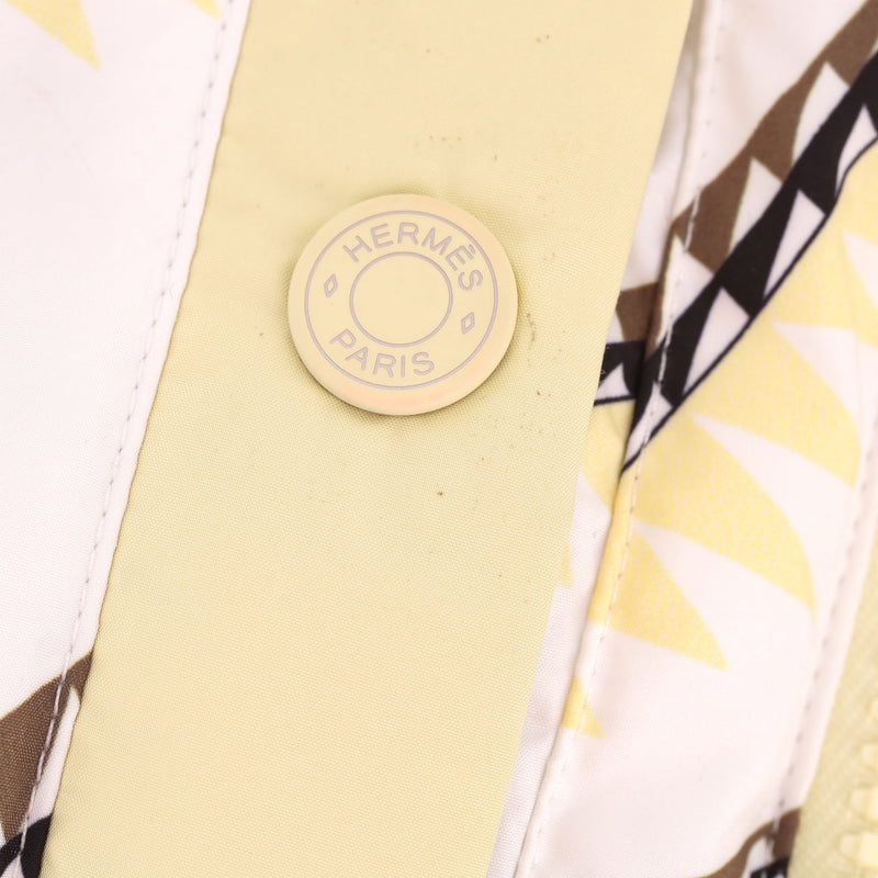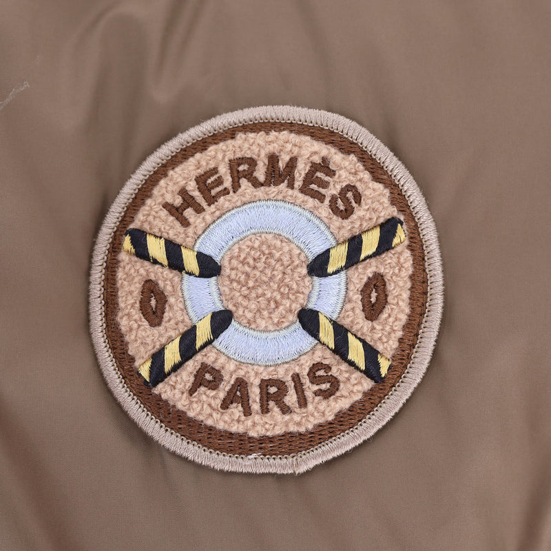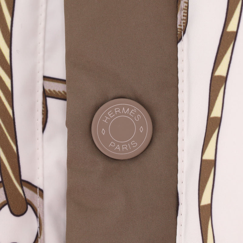 Padded reversible jacket with 'Figure Artistique Corde' pattern to the front with brown sleeves and cream collar with two-coloured 'Hermes' engraved zippers.