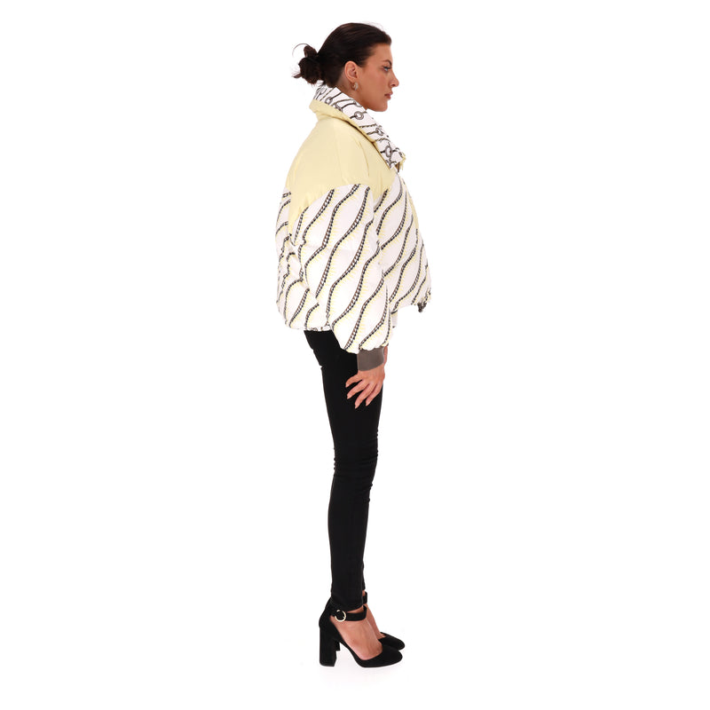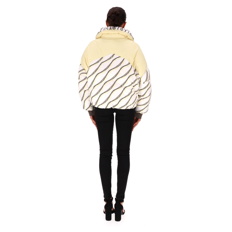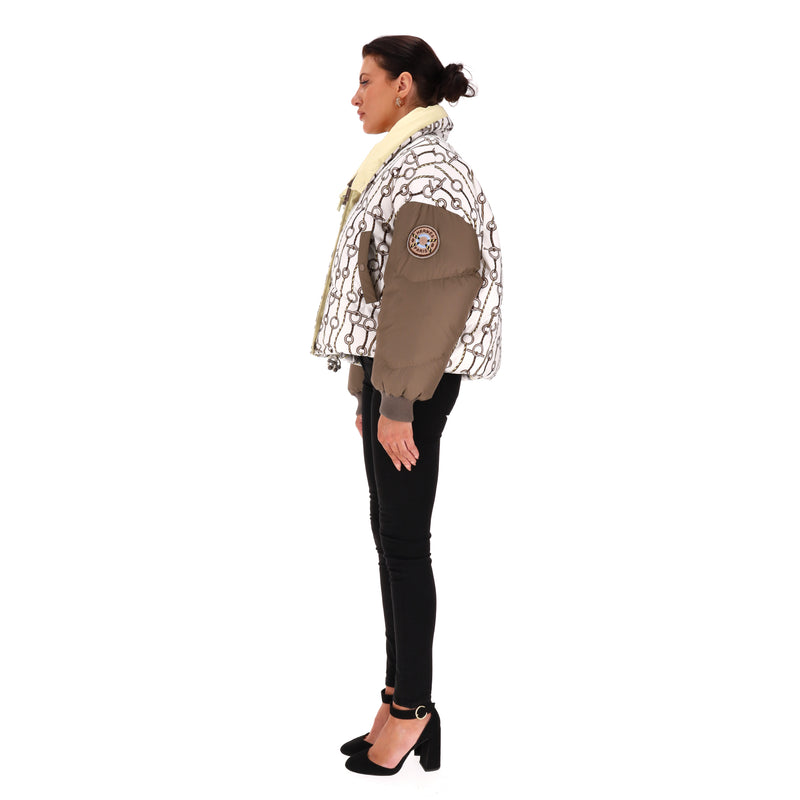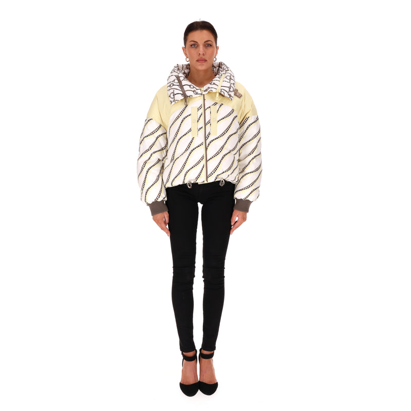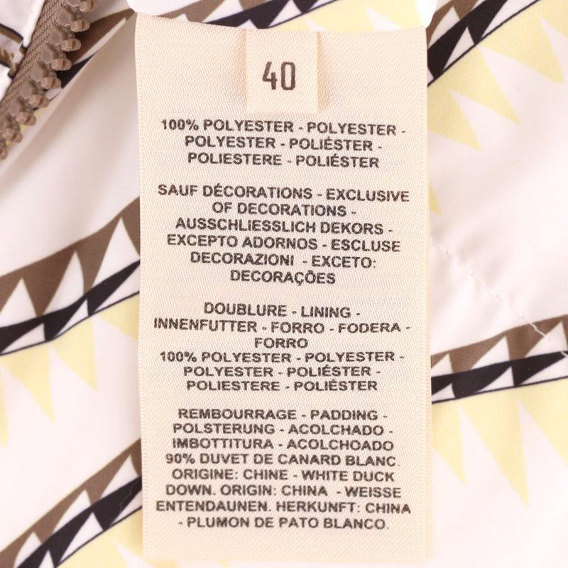 Padded reversible jacket with 'Figure Artistique Corde' pattern to the front with brown sleeves and cream collar with two-coloured 'Hermes' engraved zippers.